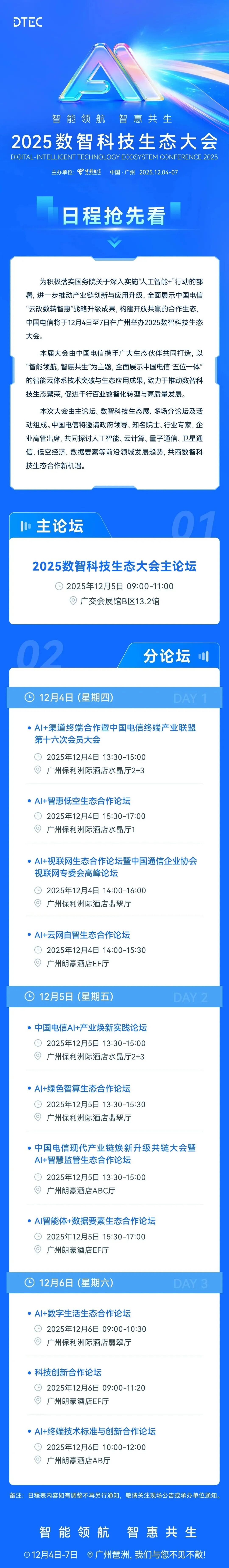 为落实国务院“人工智能 +”战略部署,推动产业链创新升级,高促会副会长单位——中国电信携生态伙伴重磅打造的2025数智科技生态大会,将于12月4日-7日在广州盛大召开!本届大会以“智能领航,智惠共生”为主题,聚焦智能云体系技术突破与生态应用成果展示,致力于搭建开放共赢平台,助力千行百业数字化转型与高质量发展。现诚邀高促会会员及行业同仁、生态伙伴共赴盛会,共探数智机遇。